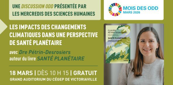 Dans le cadre des discussions sur les « ODD » (Objectifs de développement durable), nous recevons la Dre Claudel Pétrin-Desrosiers, médecin de famille au CLSC de Hochelaga-Maisonneuve et responsable de santé planétaire pour le Département de médecine familiale et de médecine d’urgence de l’Université de Montréal.