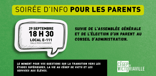 Le Cégep de Victoriaville invite les parents de ses étudiantes et étudiants à son assemblée générale annuelle, qui se tiendra le :